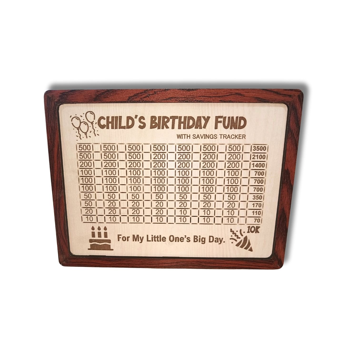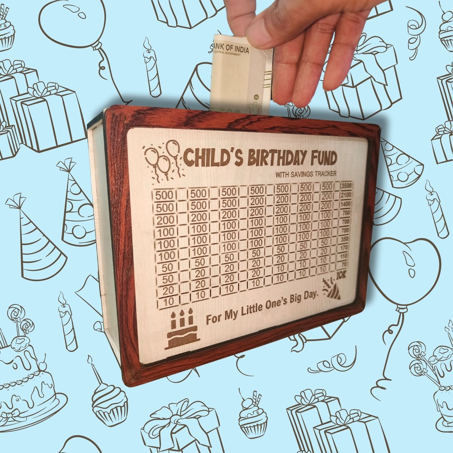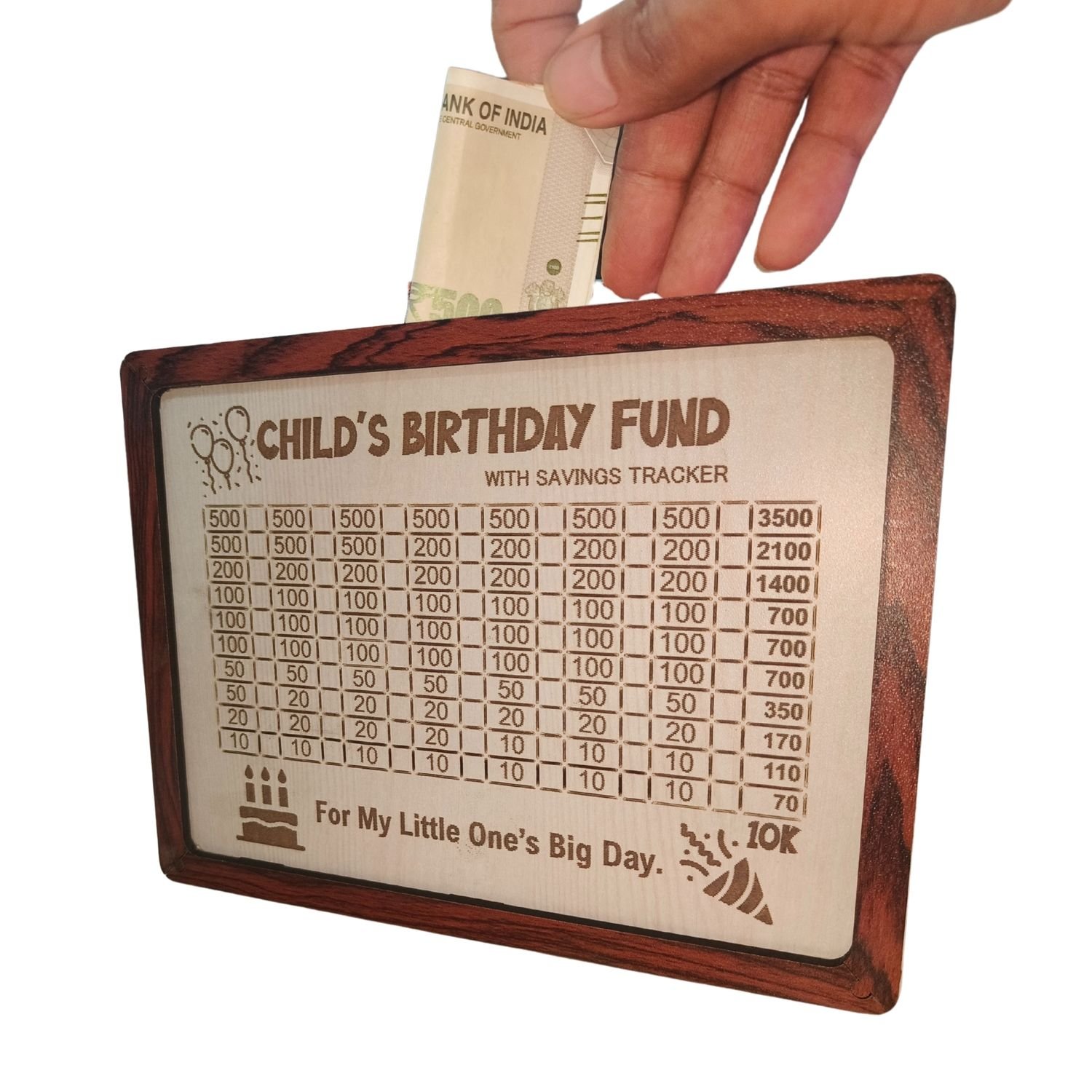 • Save ₹10,000 for Your Child’s Special Day Track your birthday savings with our engraved ₹10k goal chart. Great for gifts, parties, or surprise plans — just tick off each amount using the included marker.