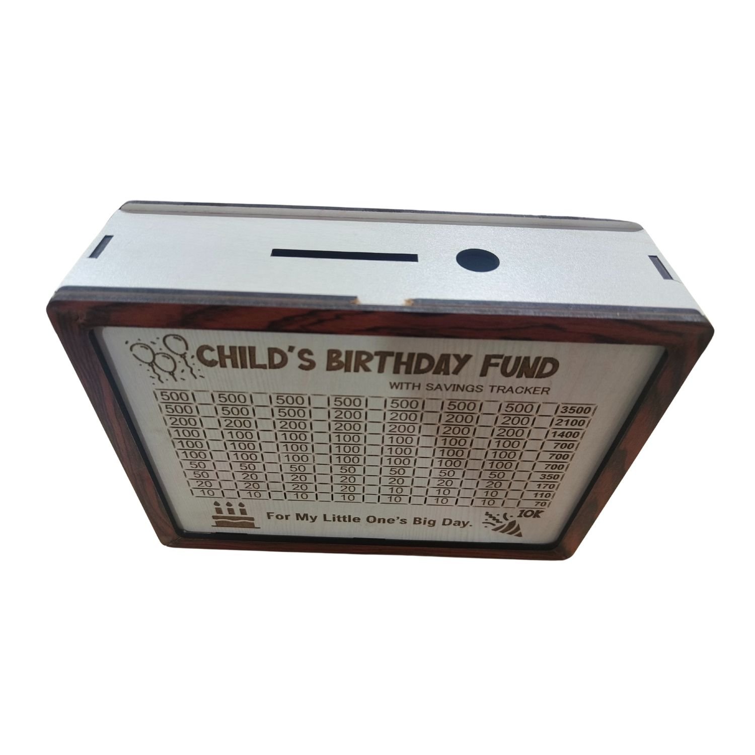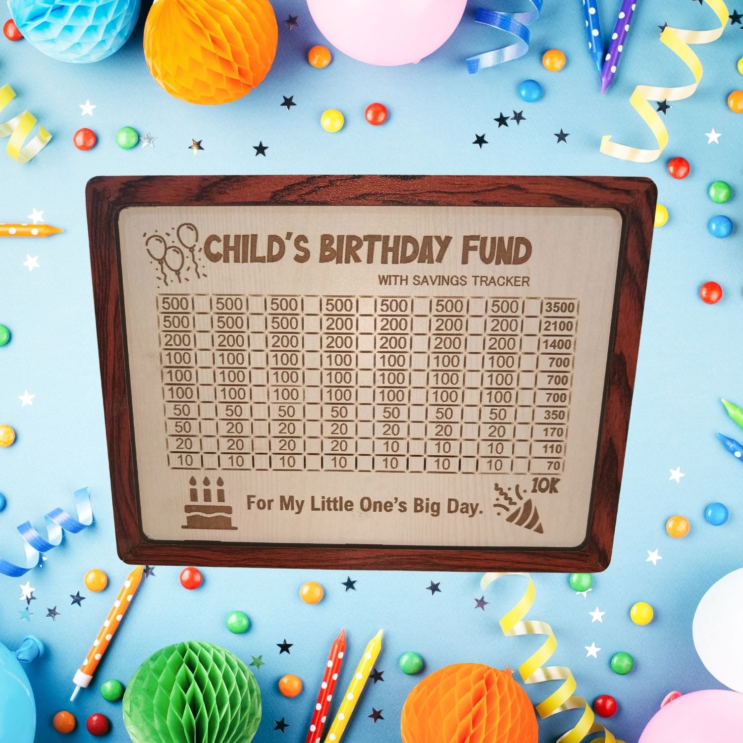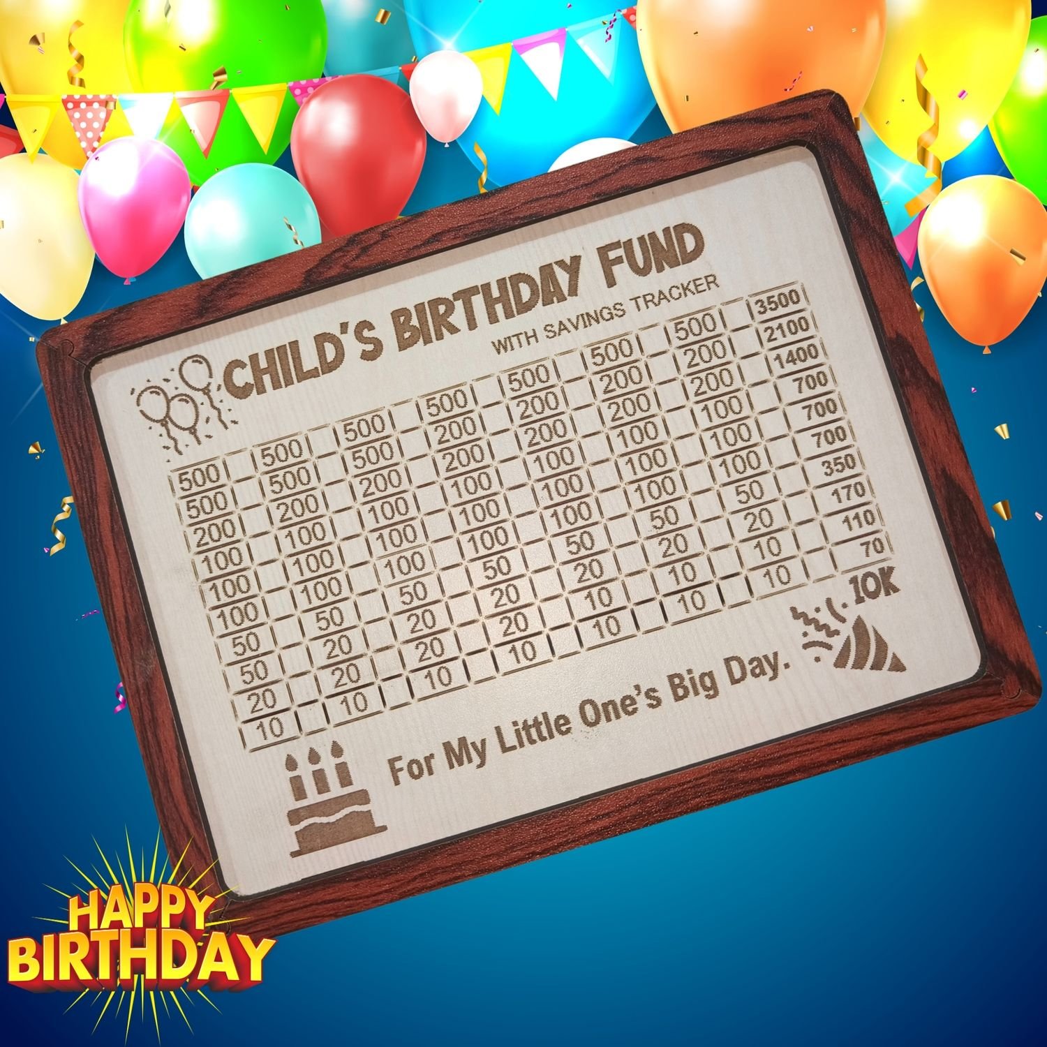 • Save ₹10,000 for Your Child’s Special Day Track your birthday savings with our engraved ₹10k goal chart. Great for gifts, parties, or surprise plans — just tick off each amount using the included marker.